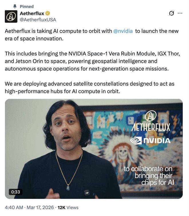 该公司在推文中高调宣布,Aetherflux正在将人工智能计算带入轨道,并与英伟达一同开启太空创新的新时代。这套方案包括将NVIDIA的Space-1 Vera Rubin模块、IGX Thor以及Jetson Orin送入太空,从而为下一代太空探索提供地理空间智能和自主操作能力。