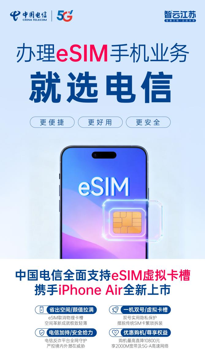 随着工信部eSIM手机商用试验批复落地,中国电信在全国31个省区市同步启动eSIM手机业务,江苏电信用户对“无卡通信”展现出高度期待。自10月22日iPhone Air手机上线以来,这股通信技术革新的浪潮进一步深度覆盖江苏大地,江苏电信全面支持eSIM手机业务,率先开通预约通道,截至目前,预约量突破2万人次,业务办理热度居高不下。