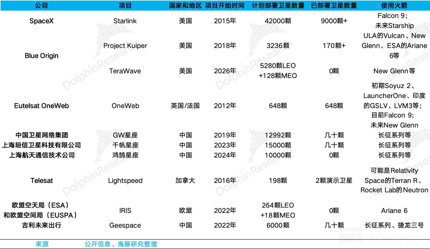 中国已经推出GW星座(中国星网)、千帆(上海垣信)、鸿鹄等星座项目,尤其是千帆定位为服务个人、企业等客户的商业项目。从审批角度,中国星网、上海垣信都已获得中国大陆的卫星互联网牌照。而2025年底,中国向ITU(国际电信联盟,是联合国下属,全球唯一负责管理卫星无线电频率、轨道资源及制定卫星通信国际标准的官方权威组织)一次性提交了涵盖GW星座、千帆星座等14个星座的频率和轨道资源申请,合计达到20.3万颗卫星,远超Starlink目前在轨数量。