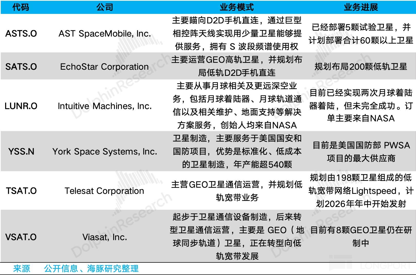 对于卫星运营环节我们更倾向于排在火箭发射公司之后。首先,对于LEO(近地轨道)星座运营公司,在SpaceX及Blue Origin巨头悬顶的竞争态势下,能否在价格、性能、服务上找到自己的差异化竞争优势,是核心观察点;而对于传统的GEO通信卫星运营公司,它们面临的是Starlink这类LEO星座的全面挑战,可关注其转型进展。以下是美股上市的主要卫星运营公司:
