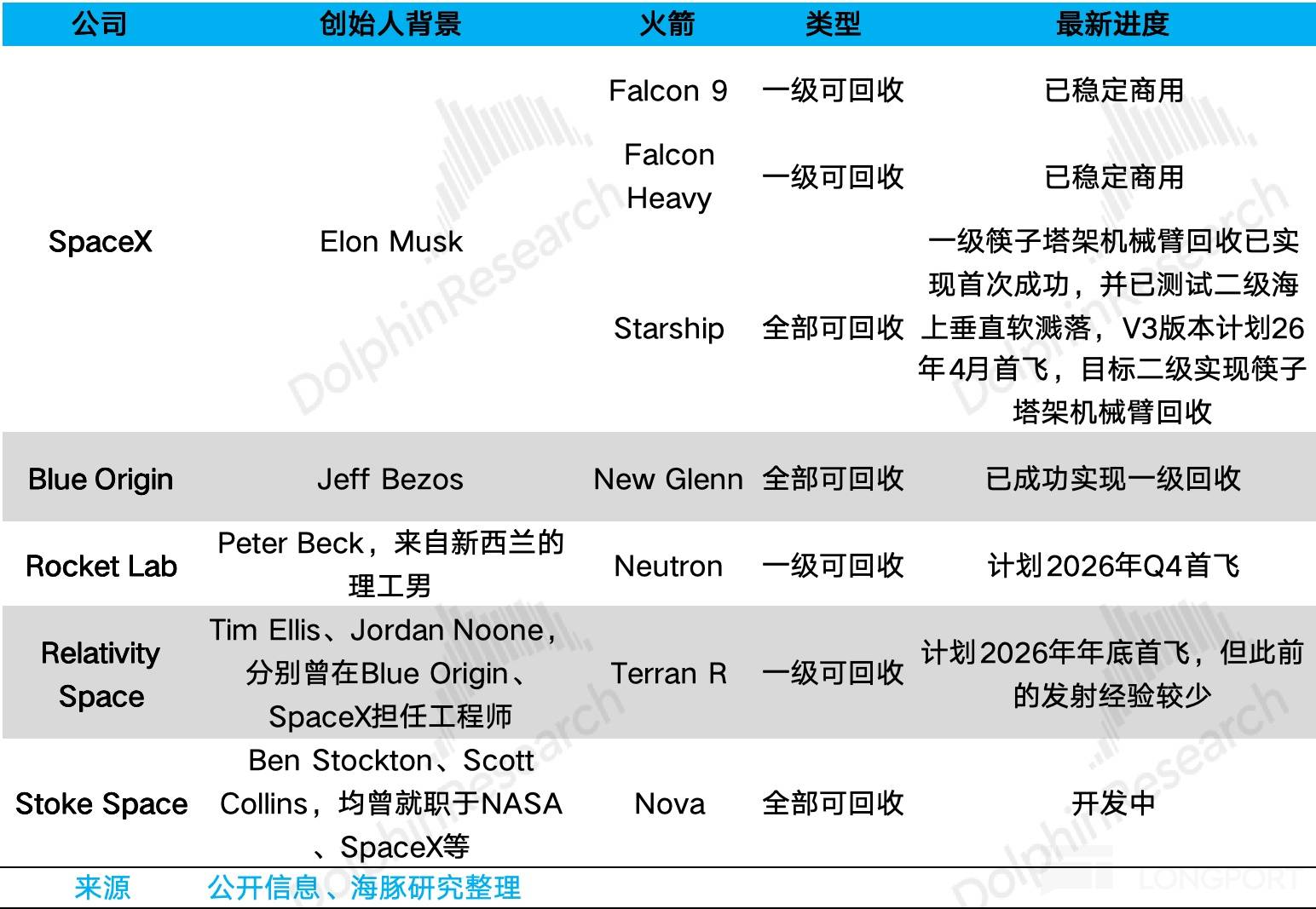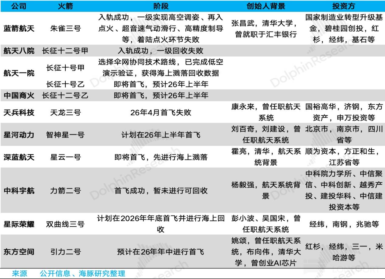 我们梳理可回收火箭领域的主要参与者,基于此主要分析两个问题:一是行业竞争格局如何,二是通过比较不同参与者技术路线和模式的不同,分析产业主要的竞争要素,及其可能涉及到的产业链环节。