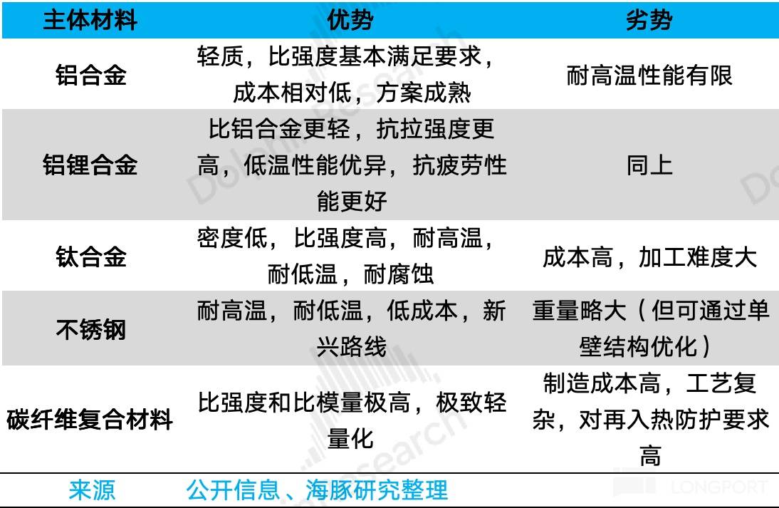 箭体包括整流罩、筒段、贮箱(用来存储推进剂)、级间段、箱间段以及尾段等。对于箭体部分,材料的选择也存在差异。Blue Origin的Glenn主要使用铝合金和碳纤维,Falcon 9则大量使用铝锂合金,而Starship几乎全部使用不锈钢。