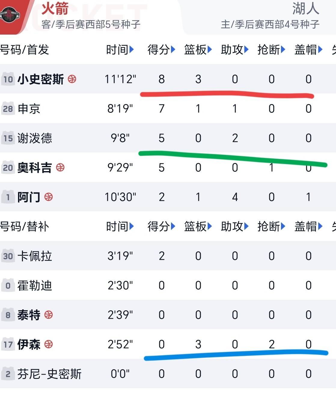 半场湖人还只领先2分,第三节后段开始拉开,第四节一上来就是一波13-3,分差直接到16分。火箭喊了暂停,回来还是断电,失误多、篮板丢得快、外线分钟,湖人稳稳控着节奏,没再给机会。