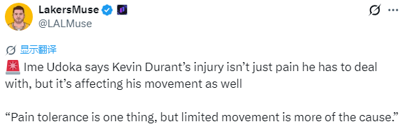 乌多卡还表示,杜兰特的伤病不仅仅是需要忍痛的问题,它已经开始影响到他的移动能力;直言:疼痛耐受度是一方面,但移动能力受限才是主要原因。
