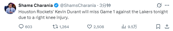 北京时间4月19日,NBA季后赛正式开打,火箭和湖人系列赛开打前,名记Shams报道,杜兰特因右膝受伤将缺席与湖人的系列赛G1;之后火箭官宣杜兰特因伤缺席第一场。