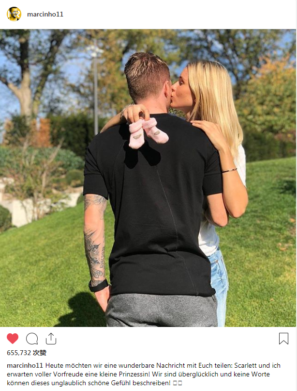 罗伊斯在INS晒出一张与女友拥吻的照片,斯嘉丽手里拎着一个粉色的小鞋,罗伊斯写道:“今天我们想要给大家分享一个好消息:我和斯嘉丽即将迎来一位小公主!我们为此感到无比幸福,言语已表达不出我们现在的美妙感觉!”