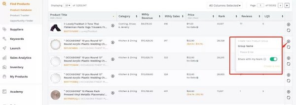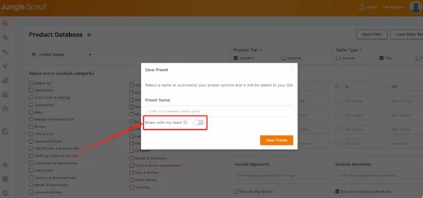 我们拿Product Database来举例,子账号在输入筛选条件后,点击右上角的“保存筛选配置”,页面会有弹窗让卖家对设置进行分组,在分组的下面就可以看到“与团队分享”的按钮,卖家可以一键进行选择,然后点击“保存筛选配置”即可。